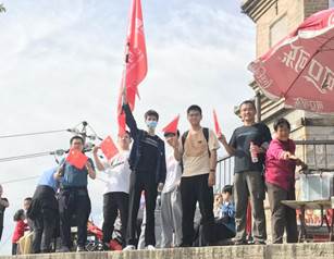 当天上午8点30分,根据活动计划安排,团队师生集合乘车从学校出发。在车上,大家挥舞着国旗,齐声高唱《歌唱祖国》,对祖国的热爱和自豪之情洋溢在大家的笑脸上。到达山脚后,团队师生在“崛围山”三个大字的巨石前合影留念,随后分四个小组进行登山。