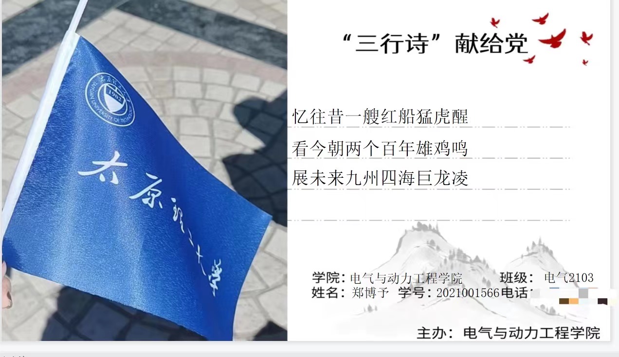 “孩童时,你是耳边的一首颂歌;少年时,你是头顶的一抹鲜红;青年时,你是心中的坚定信仰。”“携三十载峥嵘岁月开天辟地,筑七十年锦绣山河国泰民安,创千秋代伟大复兴继往开来。”一首首三行诗诉说着必赢电子游艺官网广大学子对党的真挚感情。